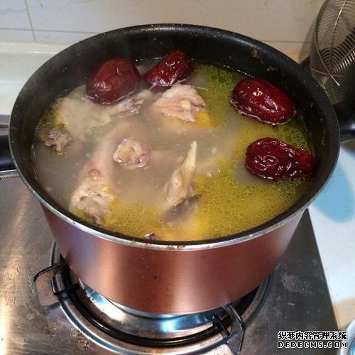 步骤4将鸡肉,生姜,榴莲和红枣放入锅中,加水,煮沸,加盖加热,煮沸并继续烹饪。